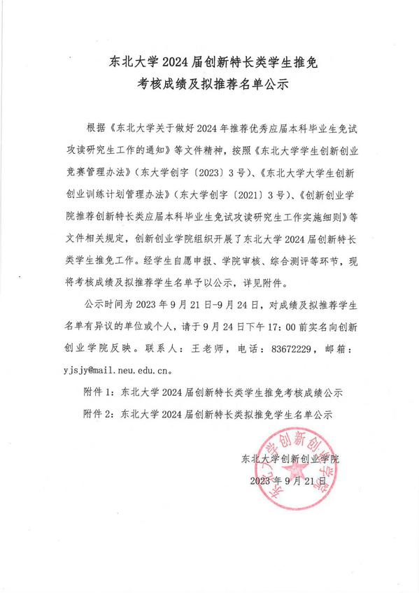 附件1:东北大学2024届创新特长类学生推免考核成绩公示(盖章版).pdf附件2:东北大学2024届创新特长类拟推免学生名单公示(盖章版).pdf东北大学2024届创新特长类学生推免考核成绩及拟推荐名单公示(盖章版).pdf