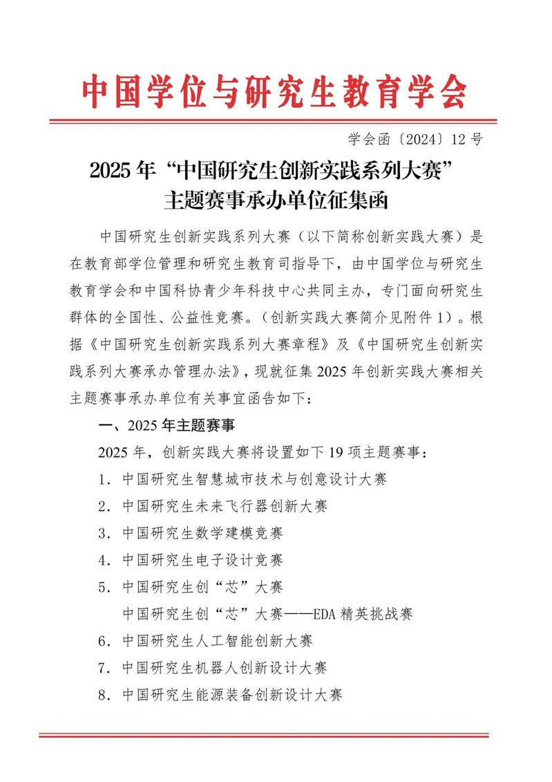 根据《中国研究生创新实践系列大赛章程》及《中国研究生创新实践系列大赛承办管理办法》,现就征集 2025 年创新实践大赛相关主题赛事承办单位有关事宜函告如下: