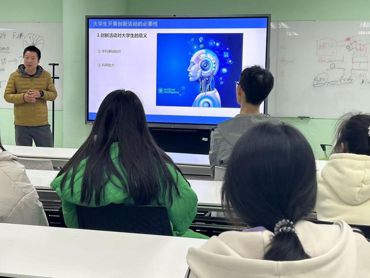 马老师从大学生开展创新活动的必要性、如何开展创新活动以及科研实践对创新思维能力的提升等几个方面进行了细致深入的讲解。他鼓励学生们要善于从社会热点中寻找创新点,将理论知识与实践相结合,创造出真正有价值的产品或服务。在互动环节,学生们积极提问,与马明旭老师进行了深入的交流与探讨。马明旭老师耐心解答,不仅传授了科研方法,还分享了自己在科研道路上的心路历程,鼓励学生们要勇于尝试,敢于失败,从失败中汲取教训,不断成长。