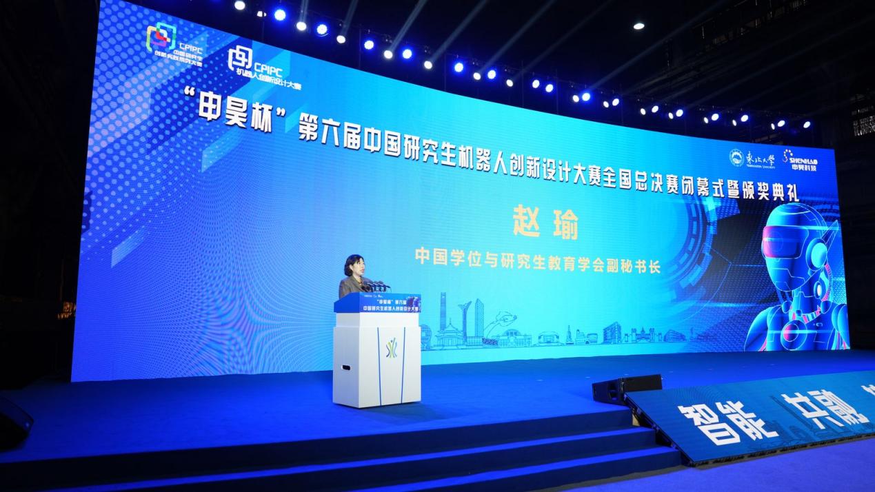大赛闭幕式暨颁奖典礼于25日下午举行。中国学位与研究生教育学会副秘书长赵瑜、山东建筑大学校长于德湖、东北大学副校长王强等出席闭幕式并为获奖单位及个人代表颁奖。赵瑜在赛事总结中指出,大赛与2024东北亚人才交流大会同期举办,活动丰富、场地独特,办出了沈阳特色,办出了东北大学的高水平。她希望,全体参赛队员以赛为始,砥砺前行,久久为功,为我国机器人产业的创新发展做出关键贡献,努力奏响高水平科技自立自强的时代强音。