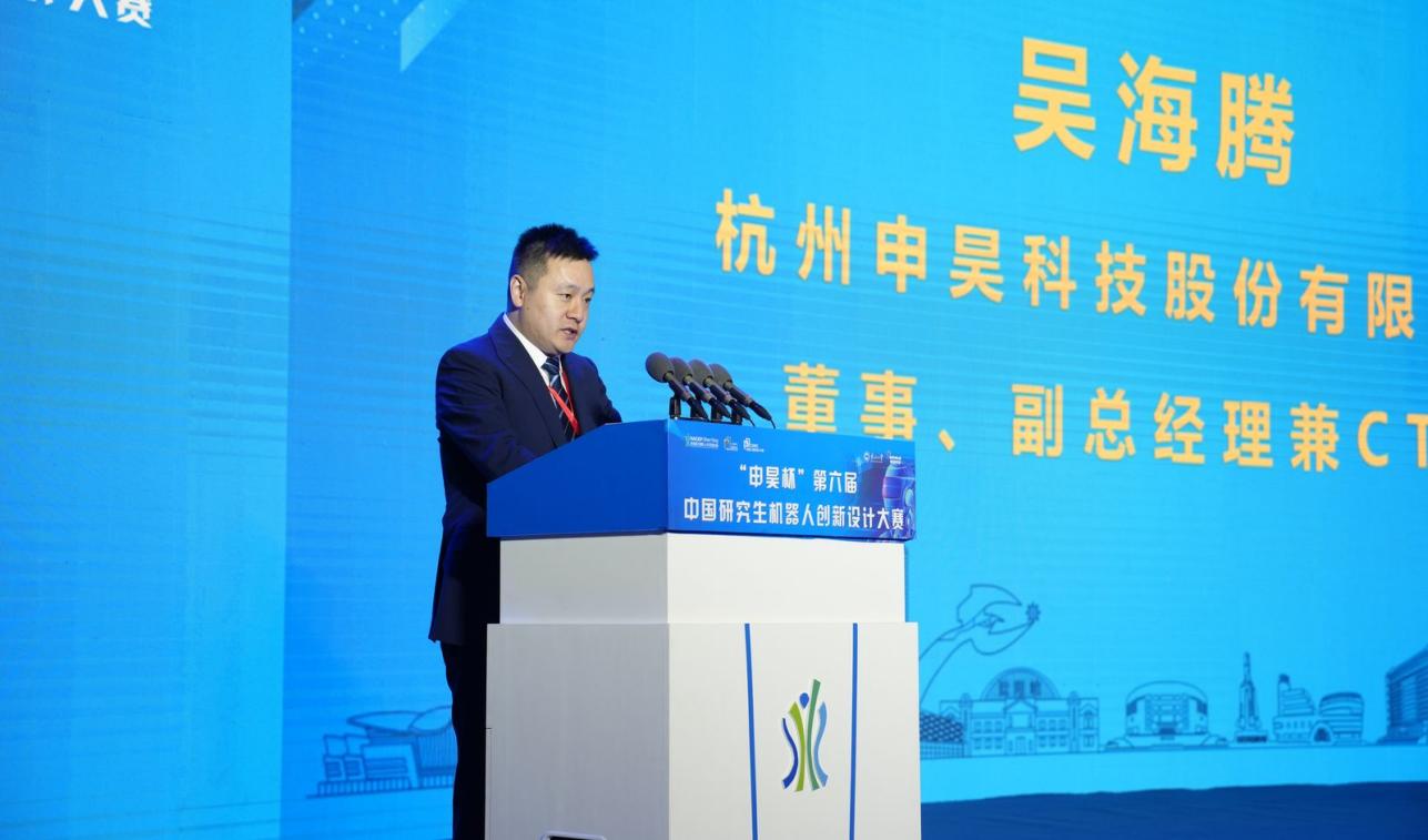 吴海腾简要介绍了杭州申昊科技股份有限公司的发展方向及特色产品。作为典型科技创新公司,申昊科技从成立以来一直高度重视产学研合作,已经连续三届赞助中国研究生机器人创新设计大赛。吴海腾希望通过大赛的平台,能够与更多优秀青年人才建立联系,共同探讨机器人经济技术的发展方向。