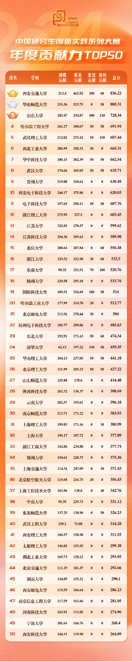 中国研究生创新实践系列大赛年度贡献力TOP50院校