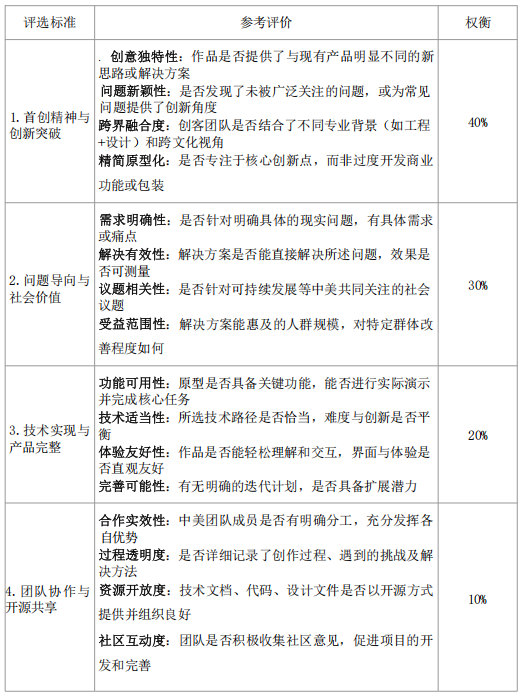(2) 创新性要求:大赛注重创客精神,鼓励创新与原创。作品需解决未被充分探索的问题或提出全新解决方案,不能与往届作品或市场现有方案重复。参赛项目须为团队近一年内新创作及未公开发表的作品,能清晰展示分赛区线下选拔赛过程中团队或个人的工作量及进步,提交的作品须在社会及技术层面上实现创新。参赛作品须是在参加中美青年创客大赛之前和期间未经商业化、产品未量产及销售、未获得商业性投资(包括但不限于风险投资机构、天使投资机构、私募基金等投资性的资助、奖励、借贷或股权性投资)、未获得政府政策性投资。分赛区选拔推荐参加总决赛的团队应未进入过往届中美青年创客大赛总决赛、应未获得往届其他教育部赛事白名单赛事的省级(含)以上奖项。大赛工作组和各分赛区选拔赛承办单位将严格对参赛作品进行创新性检索,如发现不符合竞赛规则的作品,将取消其参赛资格。
