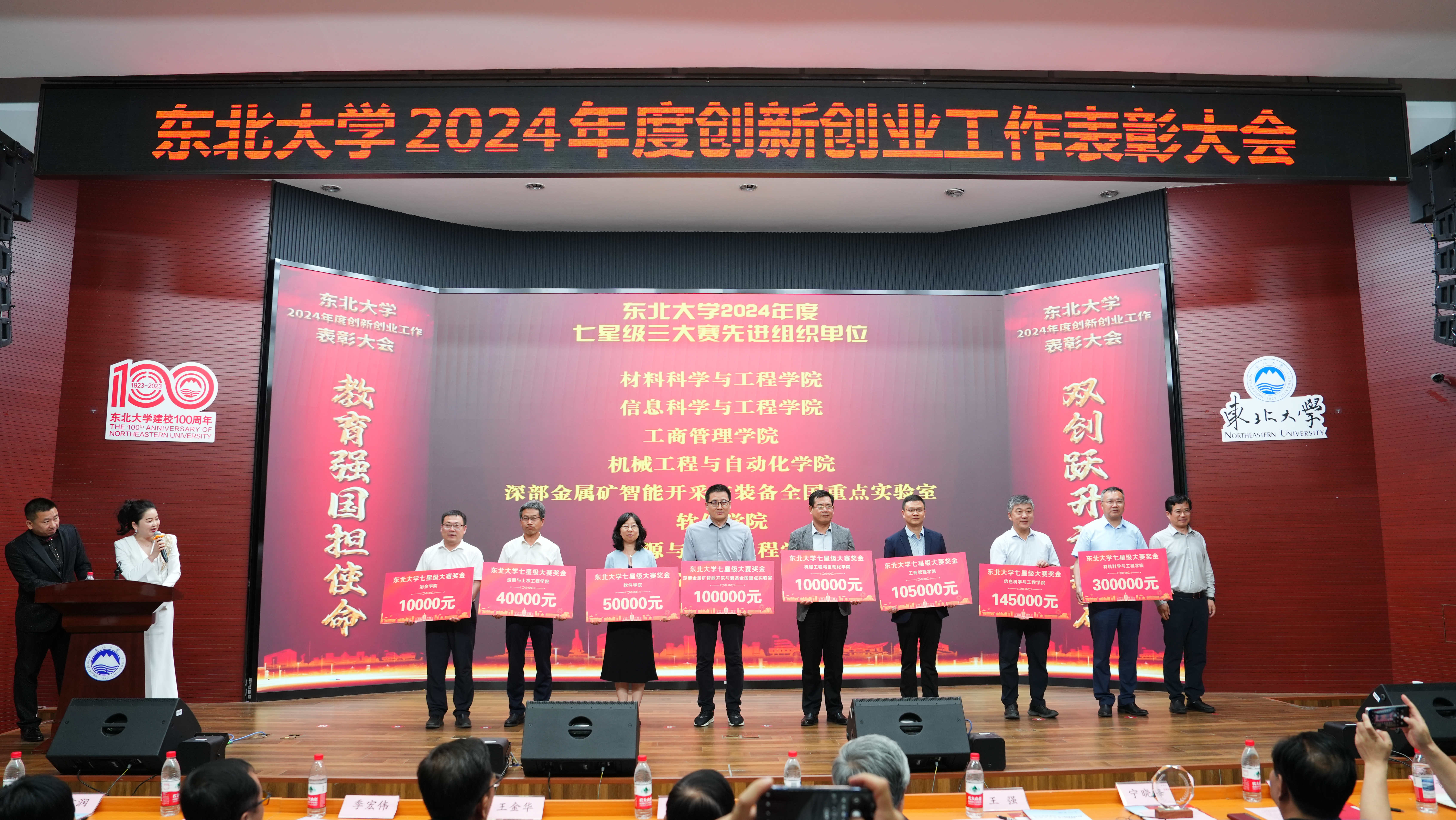 表彰大会上,全体师生共同回顾和总结了过去一年学校创新创业工作所取得的优异成绩,与会嘉宾为获奖的师生代表颁奖。吕晓等 387 名教师“东北大学 2024年度创新创业活动优秀指导教师”;江妍萱等 53 名教师“东北大学 2024年度创新创业工作先进个人”;徐也涵之等 64 名学生“东北大学2024年度‘大学生创新训练计划’优秀学生”;ACM创新团队、NEX信息安全创新团队、创意设计创新团队、仿生智能创新团队获评“东北大学 2024 年度优秀学生创新团队”;粼动仿生科技有限公司、致博智能信息科技(沈阳)有限公司、辽宁无域创想科技有限公司获评“东北大学 2024 年度优秀学生企业”;理学院学生科协技术协会等 16个学生组织获评“东北大学 2024 年度校园科技创新活动优秀学生组织”;王云泽等 64 名学生“东北大学 2024 年度校园科技创新活动优秀学生干部”;计算机科学与工程学院第九届CSE科创节等 12 个活动“东北大学 2024 年度科普立项精品活动”;吴俊杰、骆宗安、徐大可、牛东方、李小号、陆志国、何大阔、金硕巍、王冬琦、徐红丽10 名教师获评“东北大学 2024 年度创新创业十佳指导教师标兵”,霍楷、蒋忠中、刘小锋、王之琼4 名教师获评“东北大学 2024 年度创新创业教育教学名师”;华为技术有限公司、建龙集团(抚顺新钢铁有限责任公司)、青岛中鸿重型机械股份有限公司、贝壳找房(北京)科技有限公司4家单位以及李丹、邓庆绪、崔建江等7人获评“东北大学 2024 年度创新创业教育突出贡献奖”,材料科学与工程学院、信息科学与工程学院、工商管理学院、机械工程与自动化学院、深部金属矿智能开采与装备全国重点实验室、软件学院、资源与土木工程学院、冶金学院8 家单位“东北大学 2024 年度七星三大赛先进组织单位”,学校给予建设奖励经费,王强为获奖学院相关负责人颁发奖励。