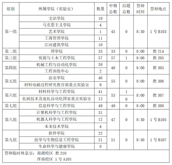 本次现场答辩评审将于6月7日(周六)于南湖校区和浑南校区分别开展,十九批申请国家级项目和十八批成果孵化、科学普及、校企合作类延期结题项目参与答辩评审。评审分九组开展,各分组答辩项目数量、答辩地点和具体时间如下: