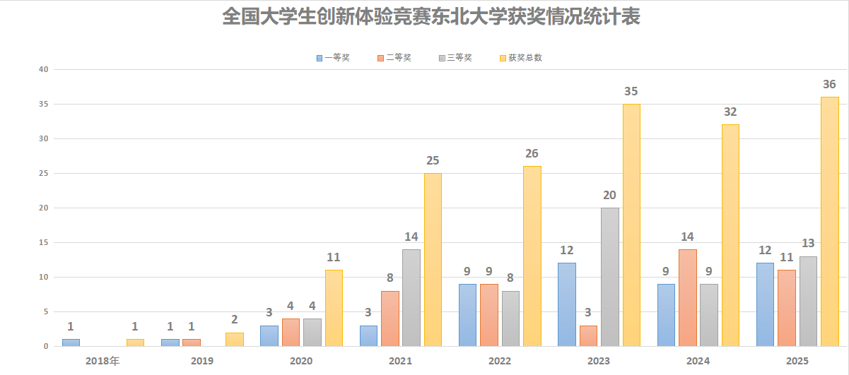 作为学校主导的创新方法类三大赛事之一,全国大学生创新体验竞赛是我校认定的国家级五星级竞赛。近年来,通过“以赛促教、赛教结合”的教学方法和教学手段改革,学校创新方法普及度和创新方法类竞赛水平显著提高。2024年,学校成为全国大学生创新体验赛东北赛区承办高校,为大赛发展做出突出贡献,师生参赛热情持续高涨。2025年,在第八届全国大学生创新体验竞赛校内赛阶段,来自不同学院的165件作品报名参赛,校内赛作品创历年新高。经过校内赛初赛和决赛选拔,学校共计推荐东北赛区区域赛65项作品,最终38项作品入围国赛、17项作品入围国赛复赛争夺国赛一等奖。国赛复赛包含七天创意比拼和决赛答辩环节,经过激烈角逐,东北大学参赛队以13项一等奖、11项二等奖和14项三等奖创历年最好成绩,保持了学校在该项竞赛中的全国领先地位。