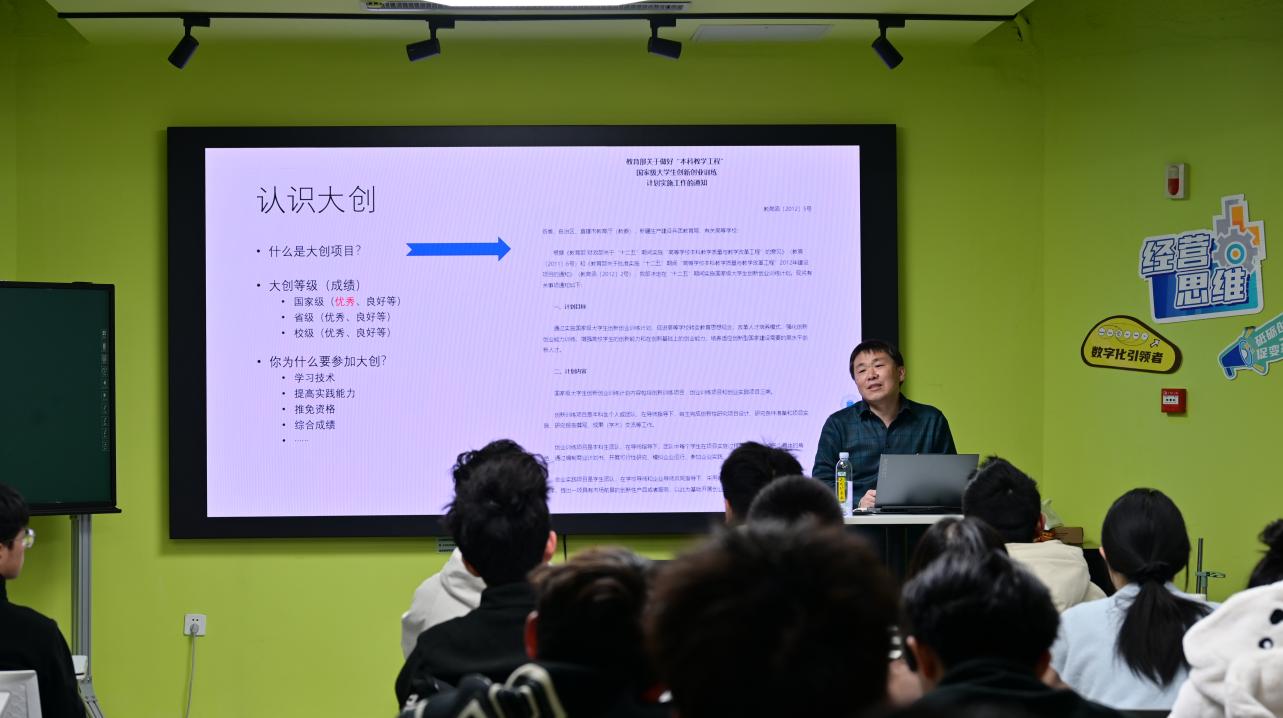 分享会上,刘冲教授以 “大创是什么”“为何要参与大创”“如何高效申报与推进大创项目” 为核心脉络,展开系统性、深层次的讲解。他着重强调,大创项目的核心主体是学生,项目负责人的主导作用远胜于指导教师的辅助角色,鼓励同学们主动打破思维局限,在自主探索中锤炼创新思维、提升实践能力,真正成为项目的 “主人”。