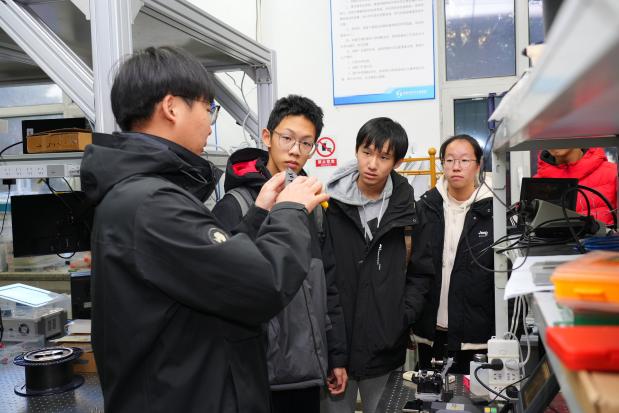 专题报告结束后,部分学生受邀走进辽宁省光纤传感与先进检测技术重点实验室,开启沉浸式实践体验。物理方向导师代表赵健、郑洪坤分别带领同学们参观了实验室的核心区域,详细展示并介绍了特种光纤的类型特性、光纤传感器的结构原理与加工制备流程。通过实物演示与现场讲解,同学们直观了解到光声光谱、光学荧光、流量测量、分布式声波传感等技术在资源勘探、周界安防、环境监测等领域的广泛应用,以及这些技术在未来物理、化学、生物量测量等方面的巨大发展潜力。近距离接触前沿科研设备、聆听专业细致的讲解,让同学们对物理学科的实践价值有了更深刻的认知,进一步激发了投身科学探索的热情。