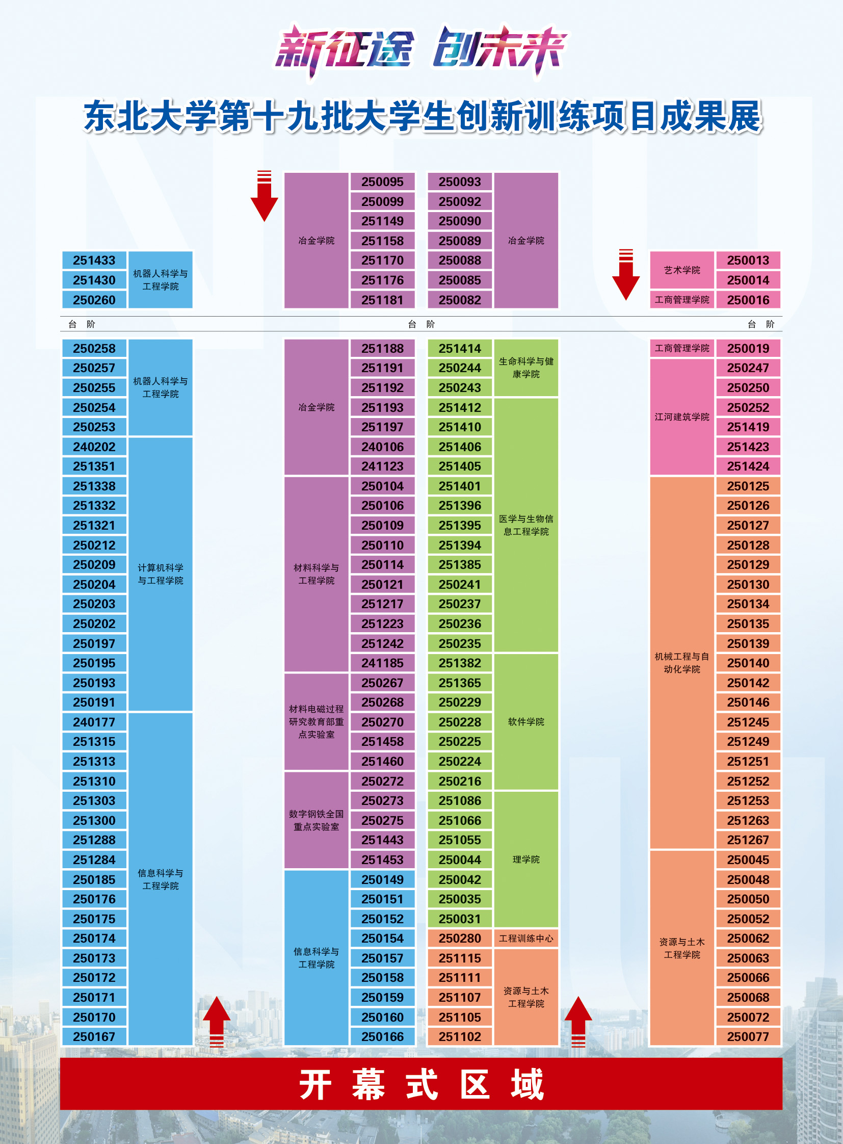 (2)参展项目的展板由学校统一制作,按照附件1中的“现场展位图(含展板颜色)”呈S序列排列,项目组可参照查找展位具体位置,具体参展项目名单详见附件2。
